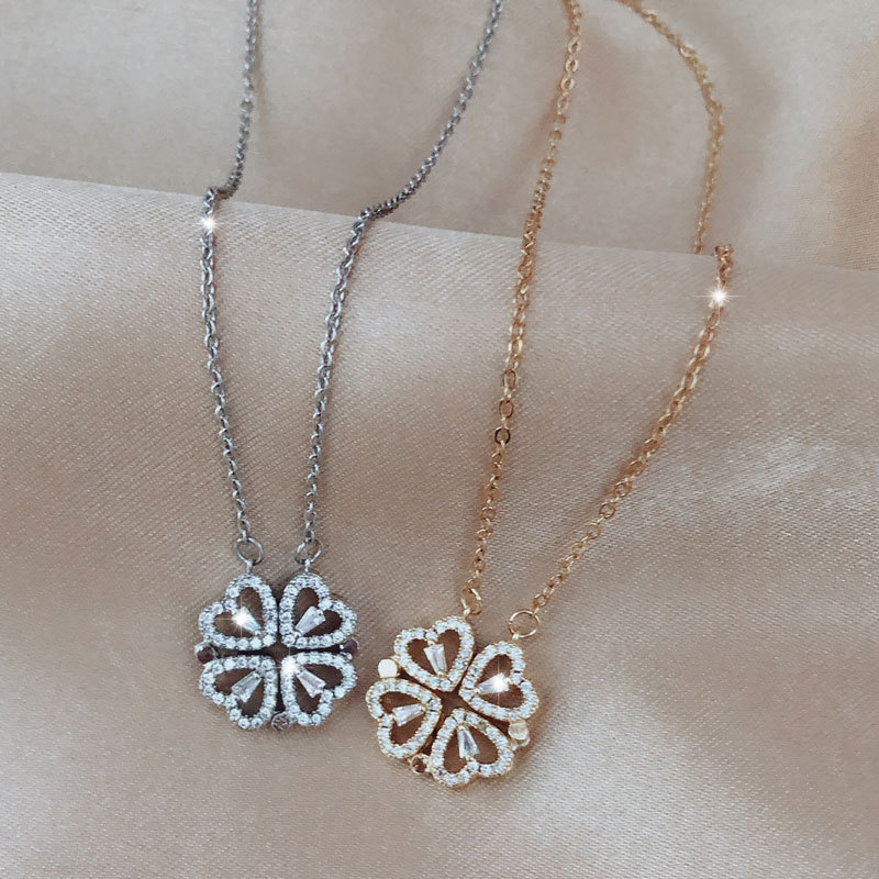 Retro magnetic folding heart-shaped four-leaf clover necklace, 4-in-1 design, multi-wearing models, the first model is that four hearts are combined into a four-leaf clover necklace, and the other is four hearts spread outlined into a 4 love-shape necklace.